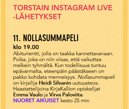 Tämä kaikkihan on suuresti jännää, koska Nollasummapeli on tuolloin juuri ilmestynyt (huhtikuussa julkaistaan), huuuuu. Jännää tämä on sikälikin, että koska en ole Instassa, en osaa mokomaa käyttää (heh!) enkä varsinkaan osaa toimia minkään livelähetys-Instan kanssa. En yhtään tiedä, mitä pitää tehdä, miten sinne pääsee etc. Että jänskää on. (Saa tulla katsomaan, kuinka jänskää.)